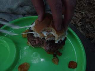 The next stop for the Delorean is last weekend at Governor Dodge State Park. The occasion is a reunion between the Brights and Scanlans that through the use of Cory's exceptional camping gear collection, culminates in the creation of possibly the most heinous fireside treat ever conceived. I give you the hamburger-marshmallow-chocolate chip cookie smore.